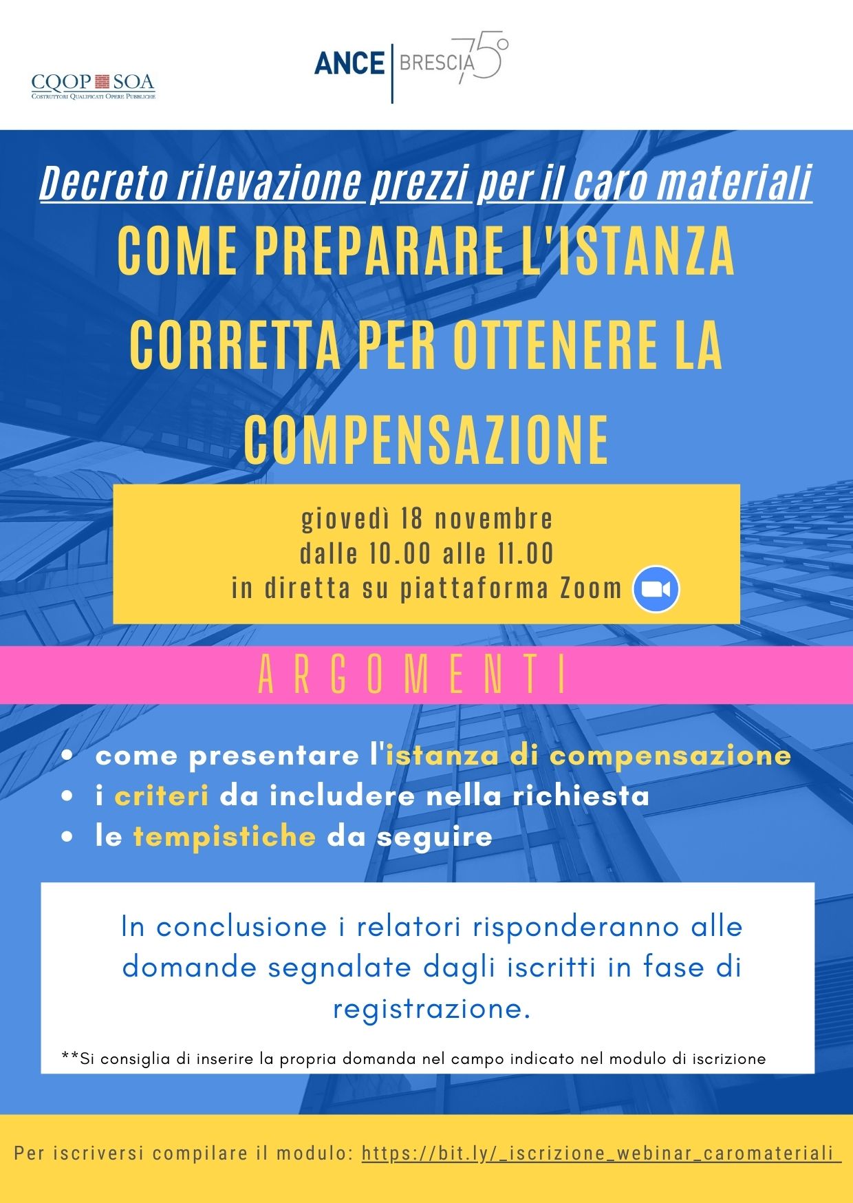“DECRETO RILEVAZIONE PREZZI PER IL CARO MATERIALI – COME PREPARARE L’ISTANZA CORRETTA PER OTTENERE LA COMPENSAZIONE” – WEBINAR – 18 NOVEMBRE