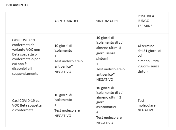 Viene in ogni caso raccomandato di prevedere l’esecuzione di un test diagnostico a fine quarantena per tutte le persone che vivono o entrano in contatto regolarmente con soggetti fragili e/o a rischio di complicanze.