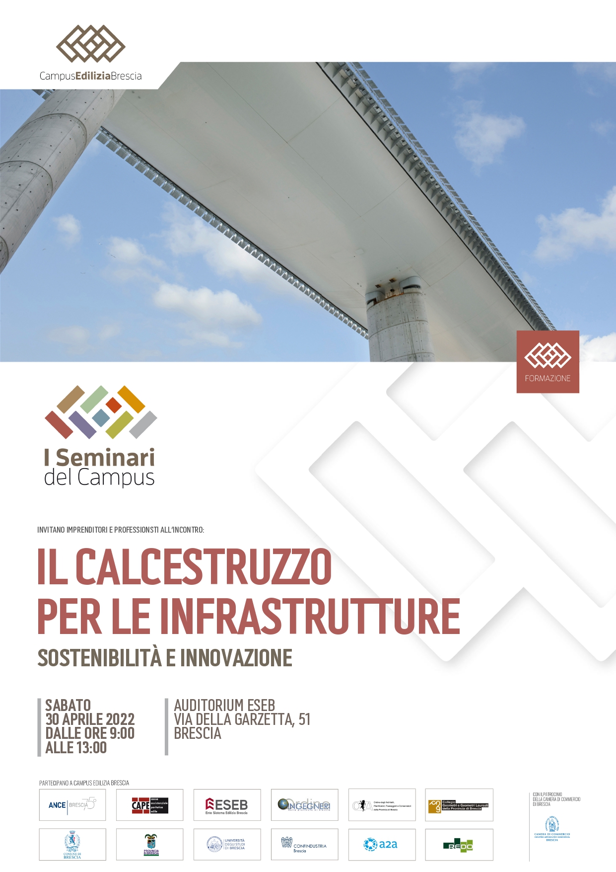 Sabato 30 aprile a partire dalle 9.00 fino alle 13.00 Campus edilizia Brescia propone un nuovo seminario dal titolo “Il calcestruzzo per le infrastrutture. Sostenibilità e innovazione.” Un incontro che ha lo scopo di fornire nozioni tecnico pratiche riguardo le nuove soluzioni per il ripristino del patrimonio infrastrutturale del Paese, con un focus specifico sui ponti in calcestruzzo armato. In particolare, verranno analizzati i calcestruzzi fibro-rinforzati ad altissime prestazioni che consentono di incrementare la vita dell’opera garantendo l’adeguamento sismico e il recupero.