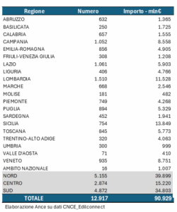 La Lombardia è la regione più penalizzata in termini di numero di progetti (1.510), seguita da Lazio (1.061) e Campania (1.052). In termini di importi è la Sicilia al primo posto (13.849 milioni), in forza del peso delle grandi opere Pnrr, seguita da Lombardia (11.528 milioni) e Veneto (8.751 milioni).